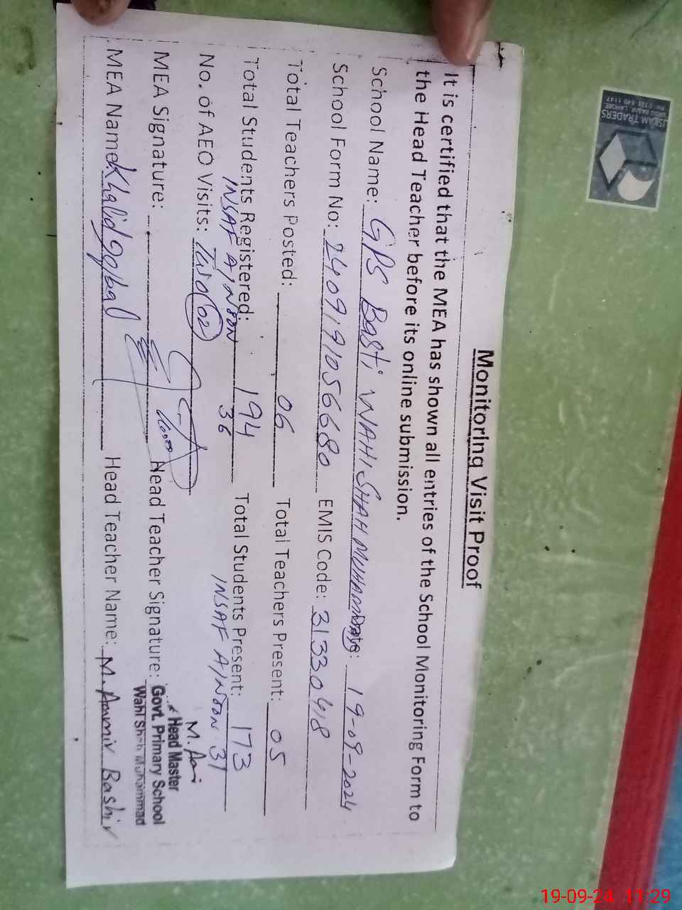 | Attendance Register | Head Teacher | MEA with School | Visit Proof |