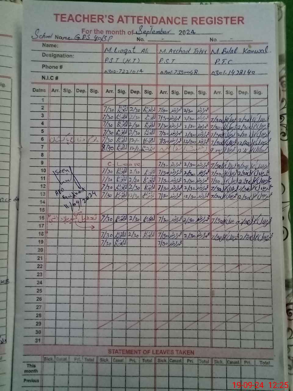 | Name: Li**** Al**** Designation: (School Headmaster's/Headmistress's) PST Phone/Cell Number: 03**** |