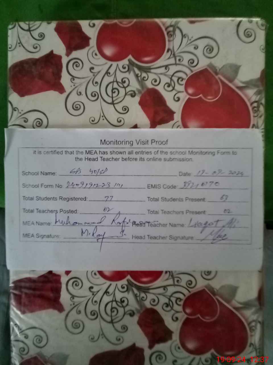 | Attendance Register | Head Teacher | MEA with School | Visit Proof |