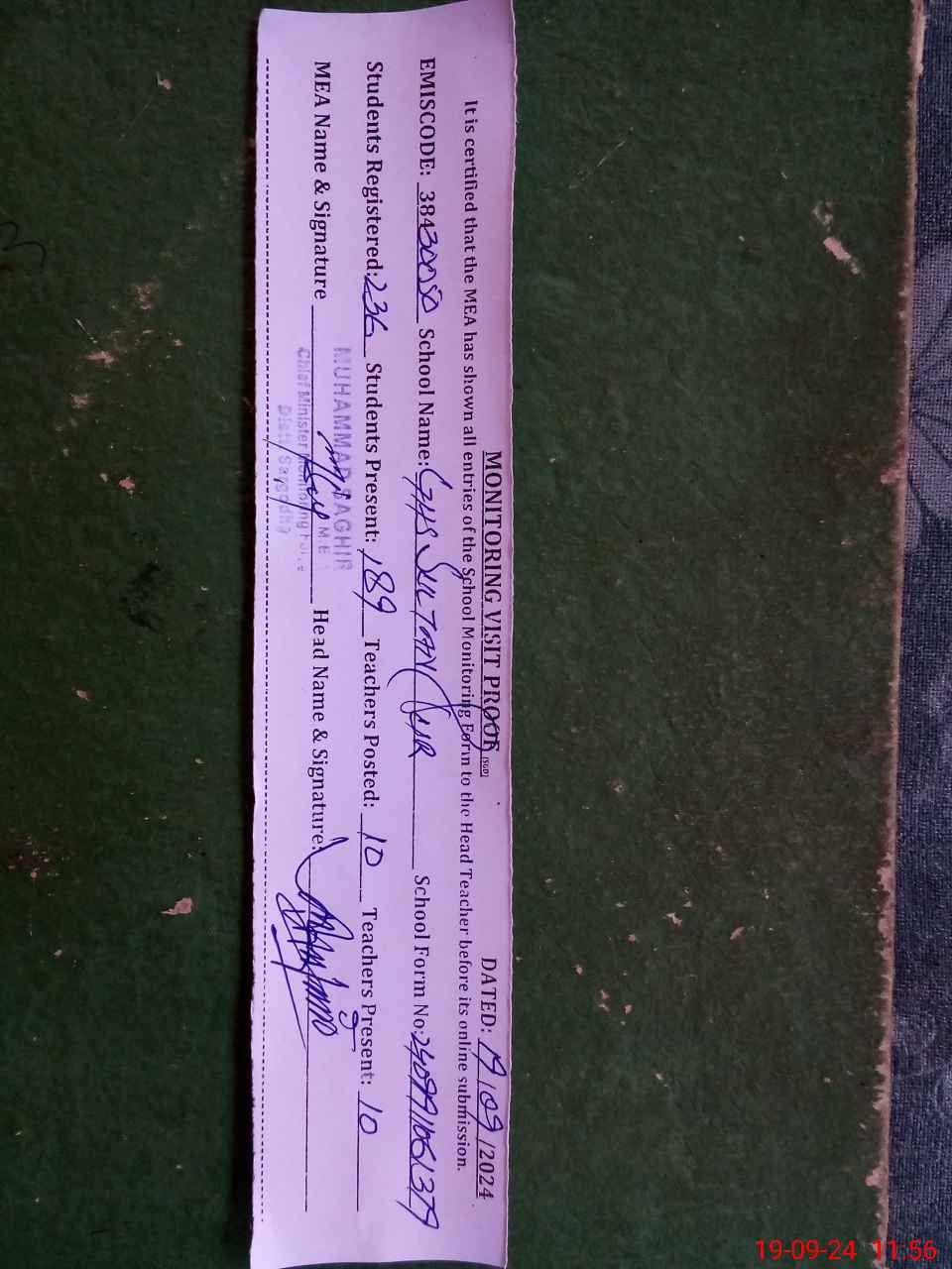 | Certified that this School was Inspected by the Undersigned MEA/DMO Today and the Information Stated Above is as Per Record. | |||||