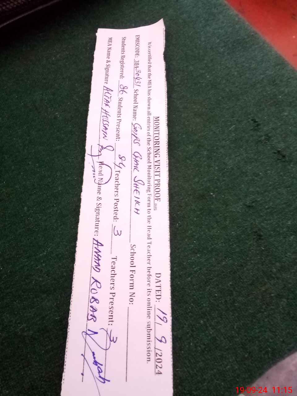 | Attendance Register | Head Teacher | MEA with School | Visit Proof |
