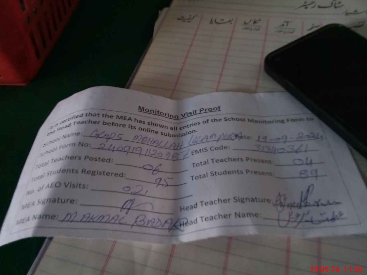 | Attendance Register | Head Teacher | MEA with School | Visit Proof |