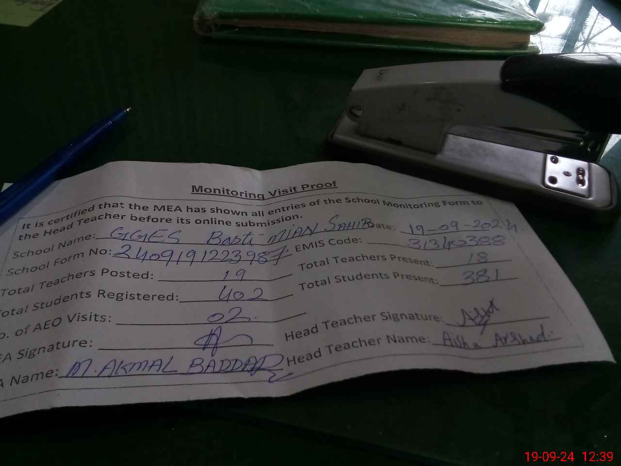 | Attendance Register | Head Teacher | MEA with School | Visit Proof |