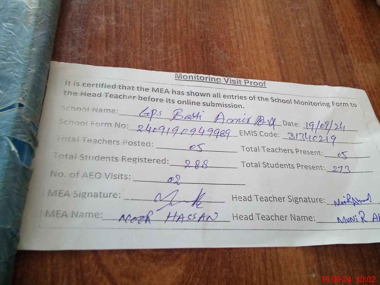 | Attendance Register | Head Teacher | MEA with School | Visit Proof |