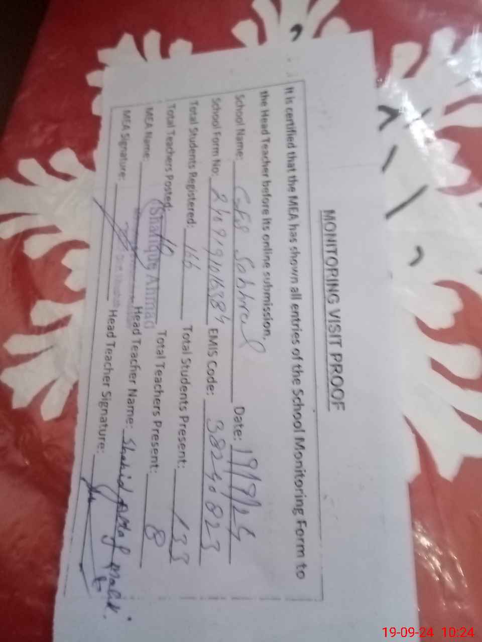 | Certified that this School was Inspected by the Undersigned MEA/DMO Today and the Information Stated Above is as Per Record. | |||||