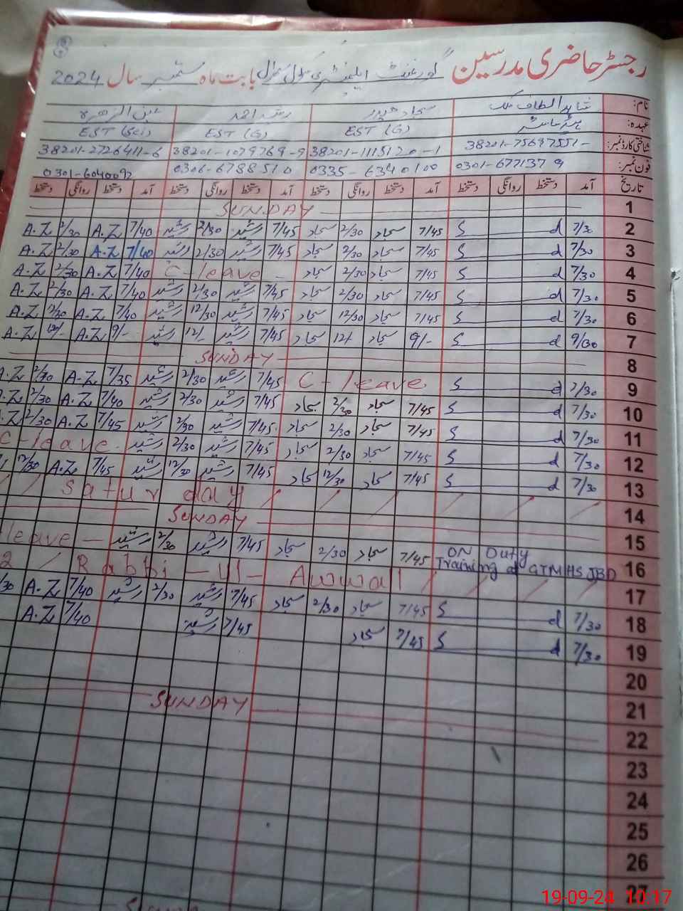 | CNIC | Full Name | Designation | R/C | Absence During Last Calender Month |