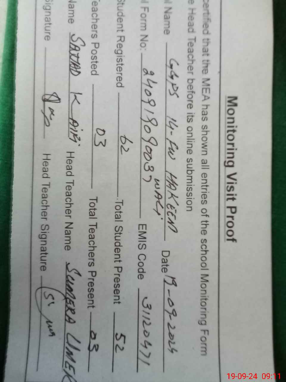 | Attendance Register | Head Teacher | MEA with School | Visit Proof |