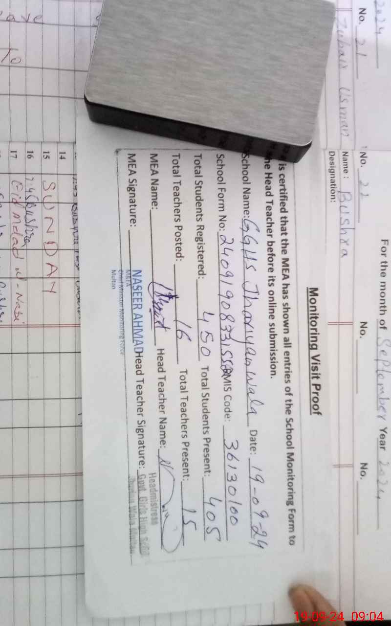 | EMIS Code: 36130100 | Name of School: GGHS JHARIYAN WALA MOUZA MADINA MULTAN | |||