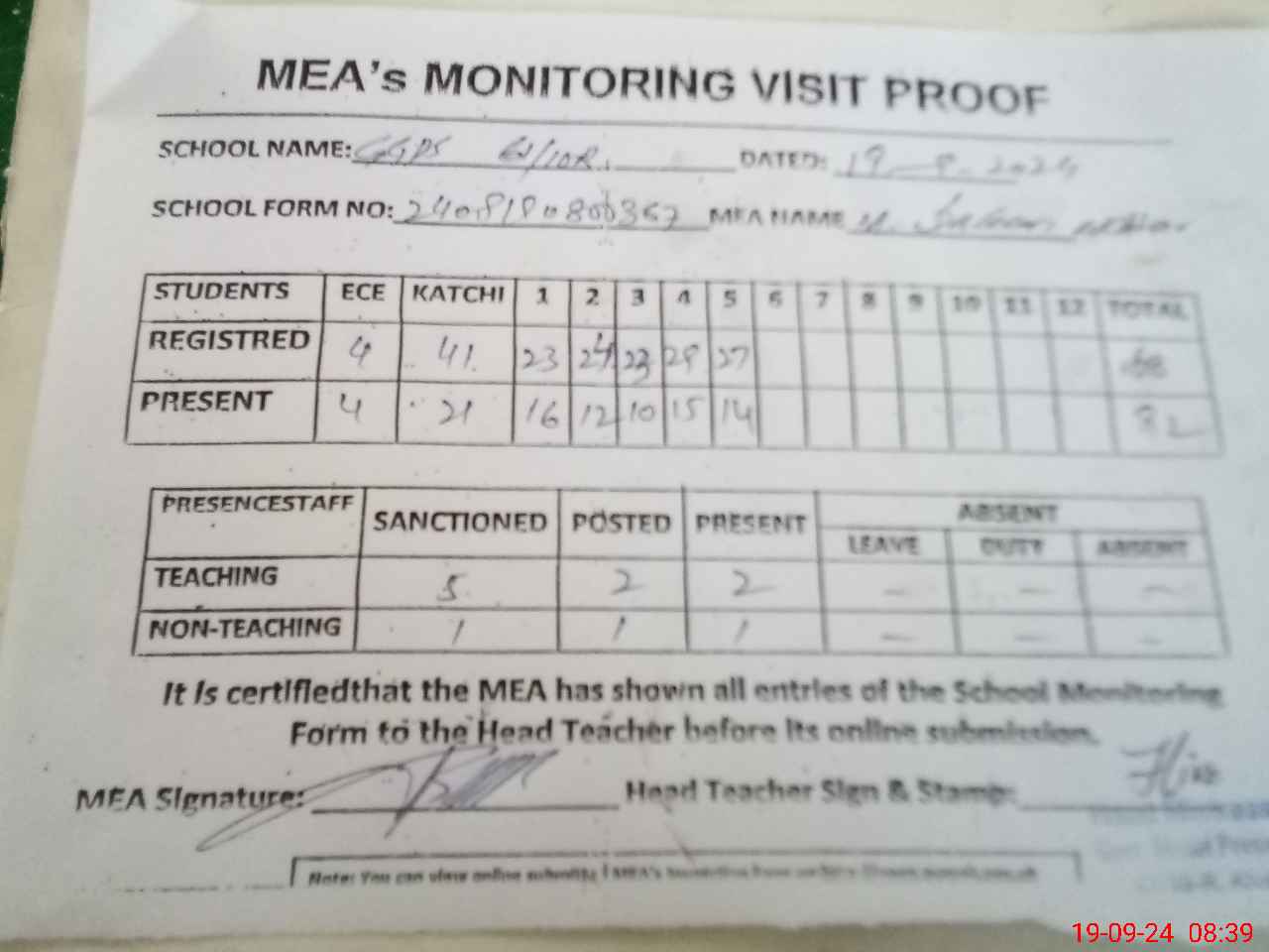 | Attendance Register | Head Teacher | MEA with School | Visit Proof |