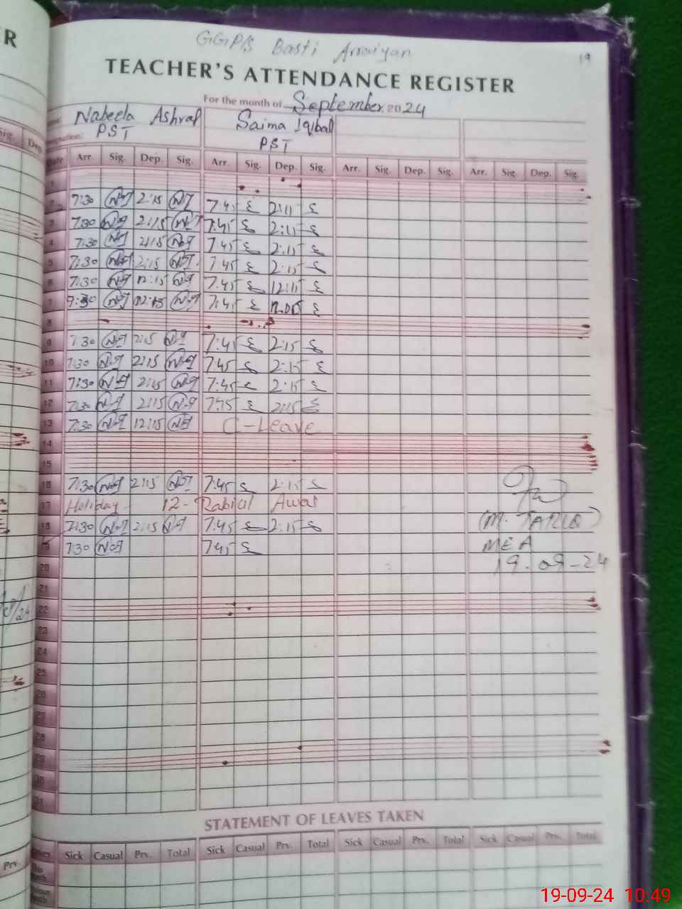 | Monitoring Date: 19-09-2024 | Start Time: 19-09-2024 10:47 AM | End Time: 19-09-2024 11:23 AM | Name of MEA: MU**** TA**** | |
