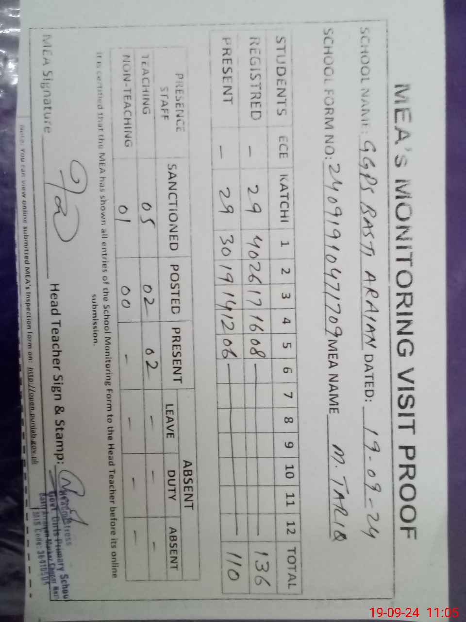 | Attendance Register | Head Teacher | MEA with School | Visit Proof |