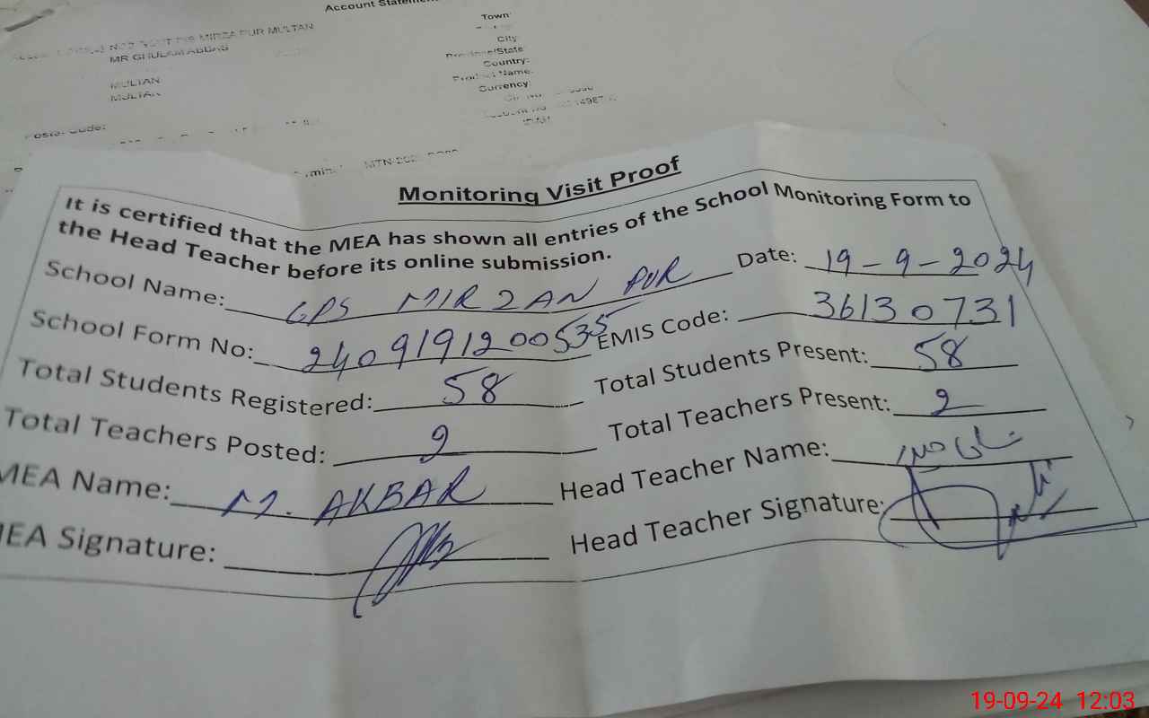 | Attendance Register | Head Teacher | MEA with School | Visit Proof |