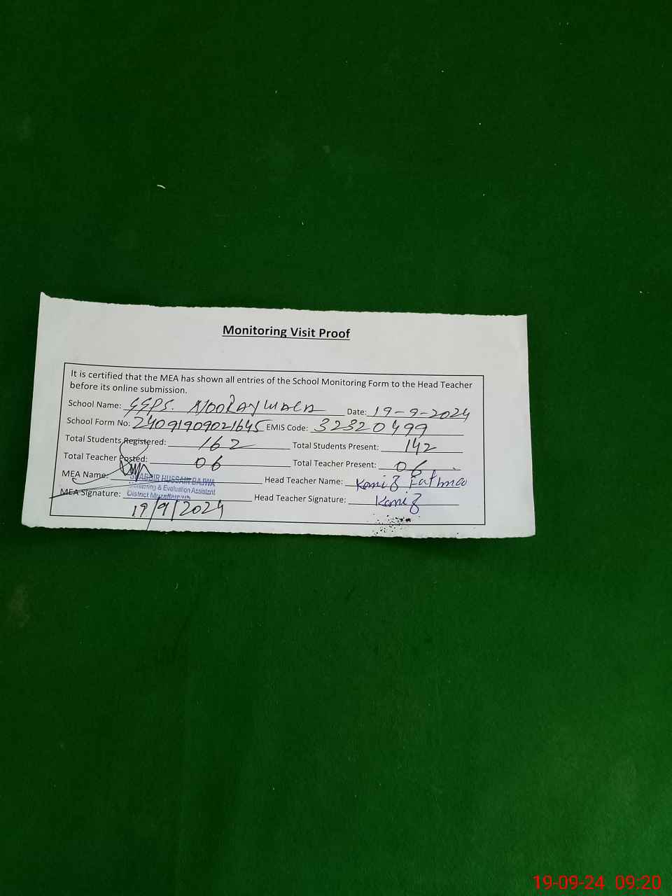 | Attendance Register | Head Teacher | MEA with School | Visit Proof |