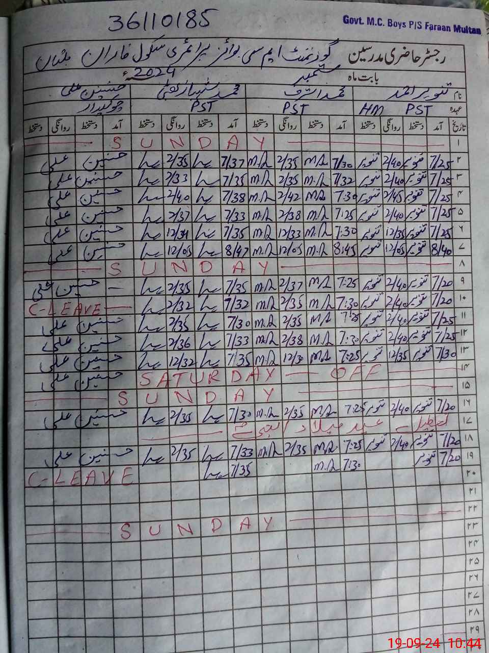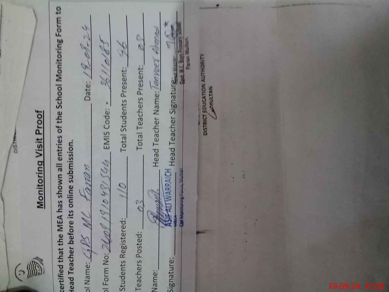 | EMIS Code: 36110185 | Name of School: GPS MC FARAAN NEAR KHONI BURJ MULTAN | |||