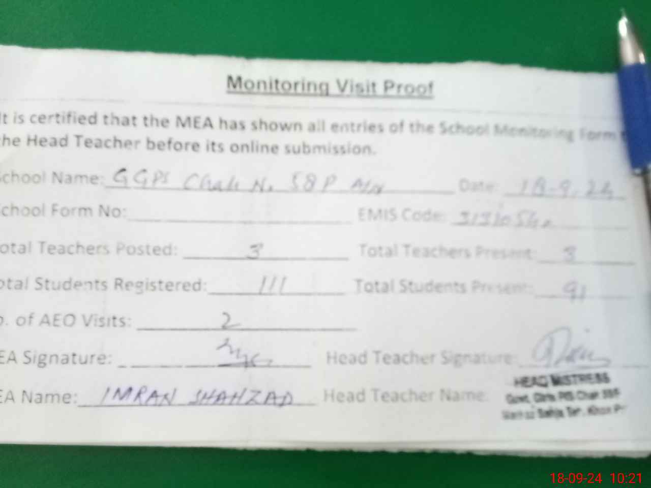 | EMIS Code: 31310540 | Name of School: GGPS CHAK NO 58/P (After Noon) | |||