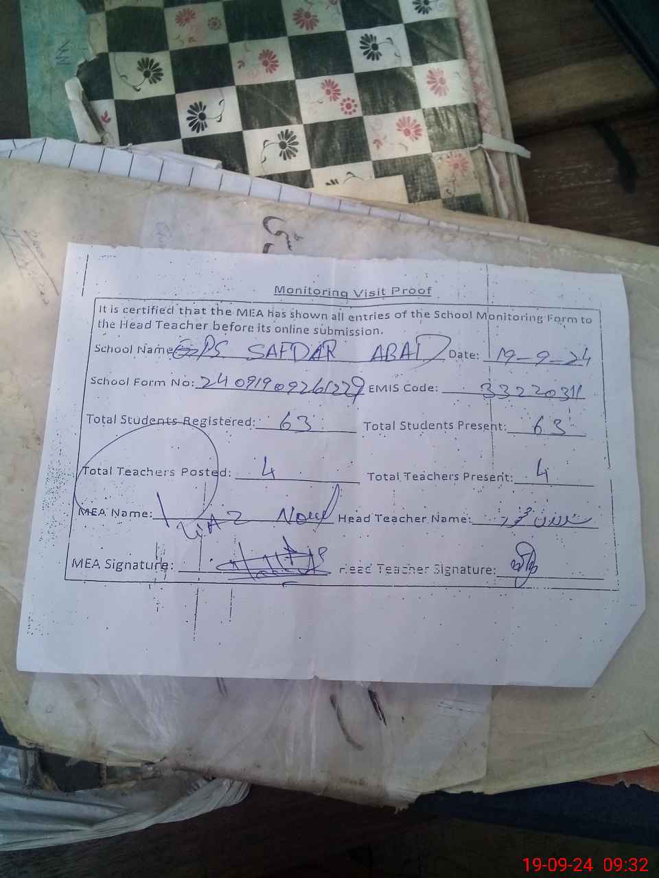 | Attendance Register | Head Teacher | MEA with School | Visit Proof |