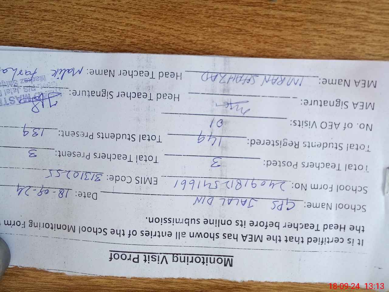 | EMIS Code: 31310255 | Name of School: GPS JALAL-UD-DIN | |||