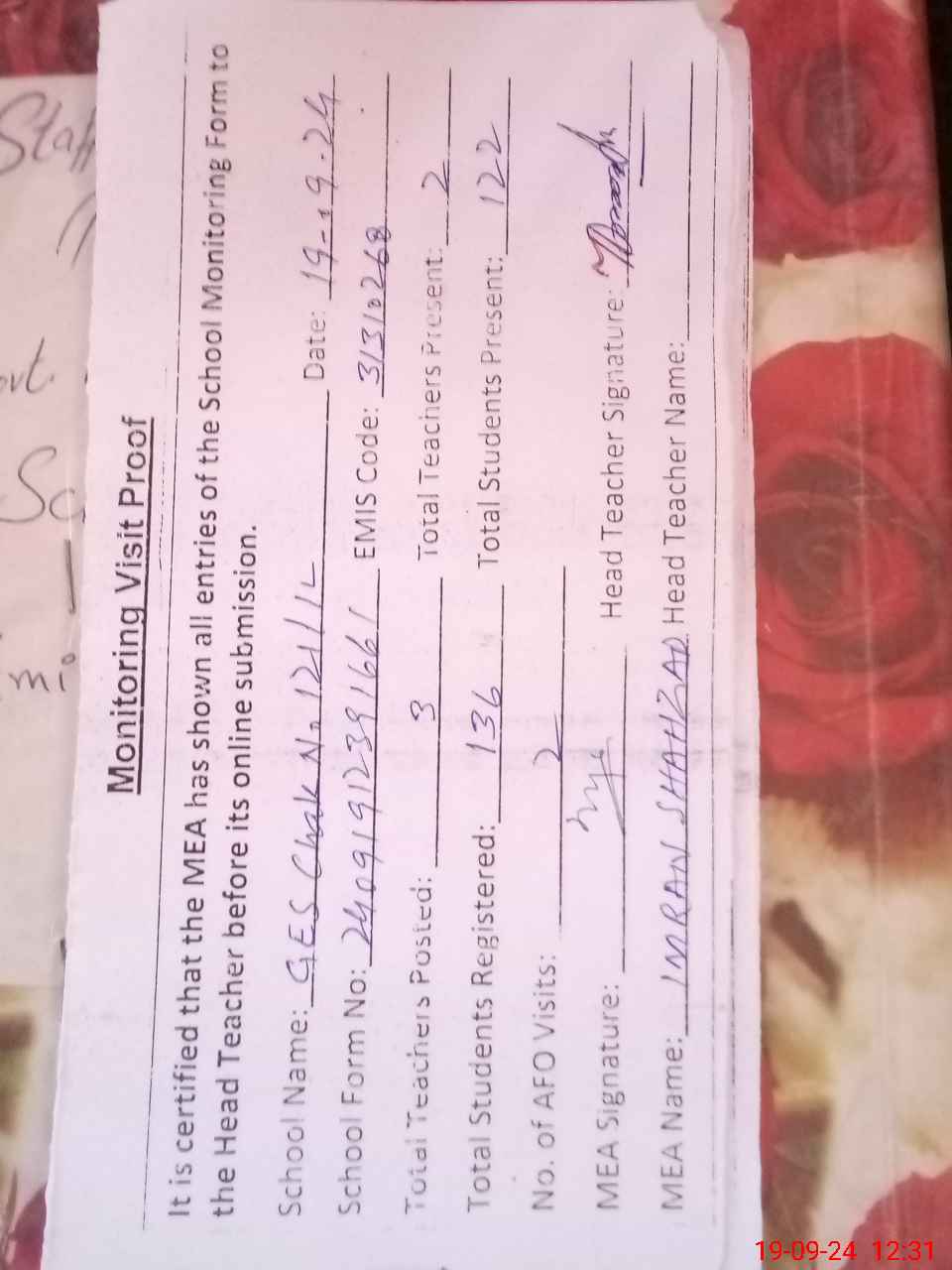 | Attendance Register | Head Teacher | MEA with School | Visit Proof |