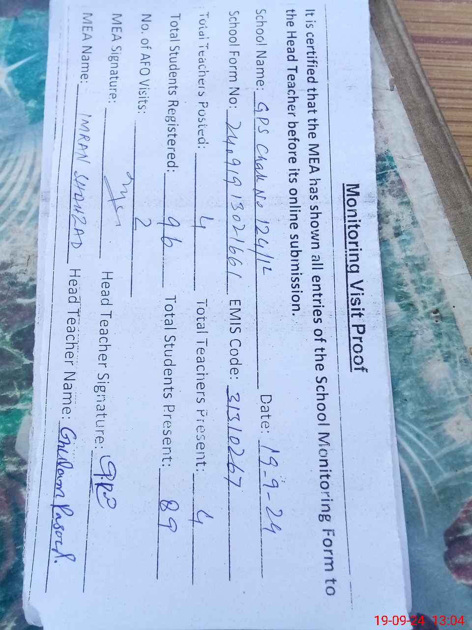 | EMIS Code: 31310267 | Name of School: GPS CHAK NO. 124/1-L | |||