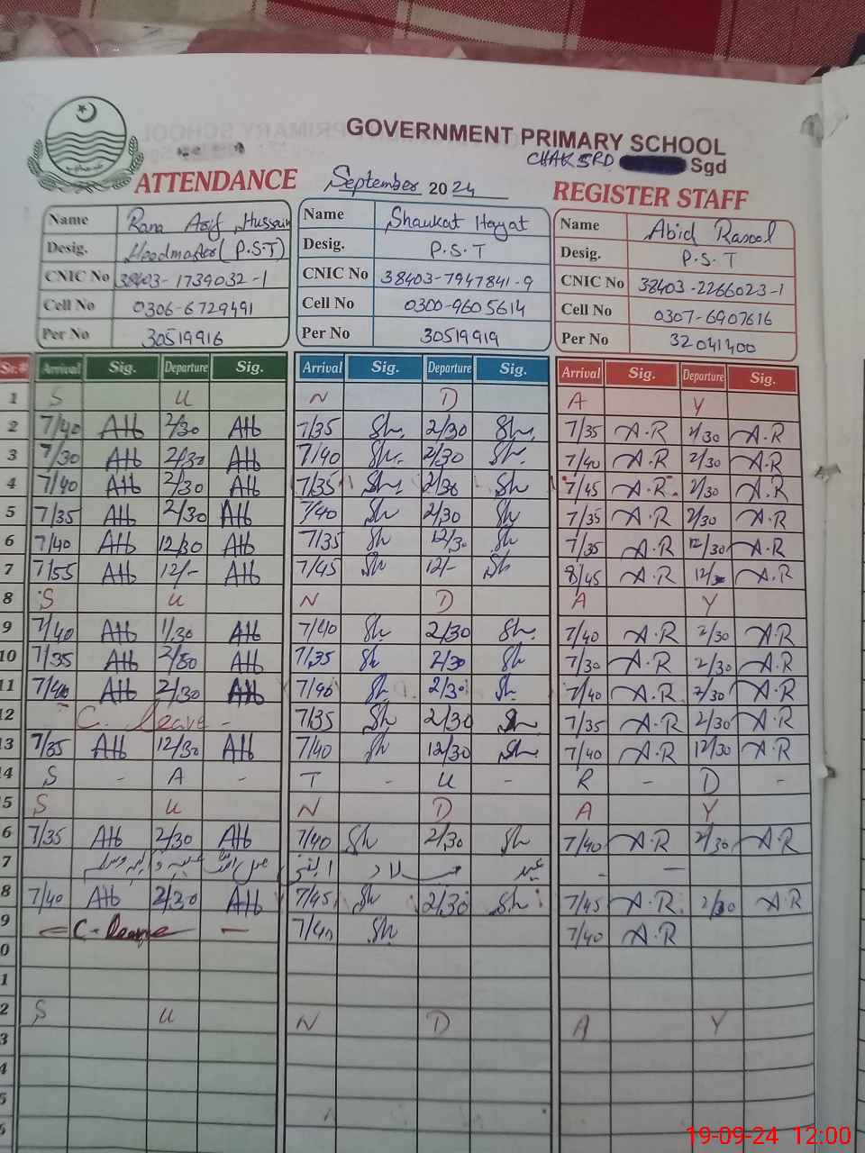 | CNIC | Full Name | Designation | R/C | Absence during last cal. month |