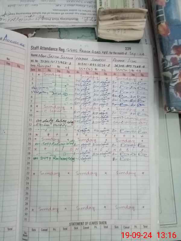 | CNIC | Full Name | Designation | R/C | Absence During Last Calender Month |