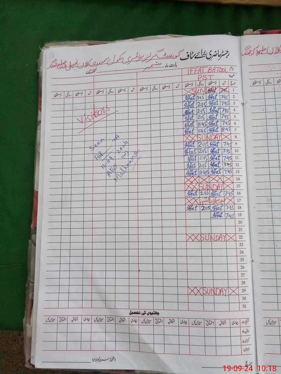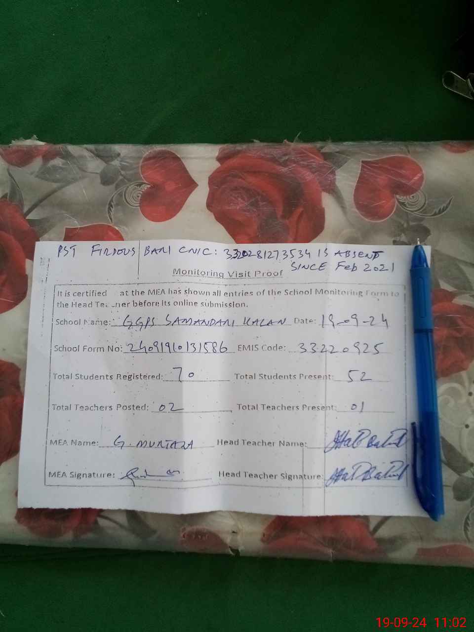 | Remarks (Use Separate Page if Required): PST Firdous Bari CNIC 3320281273534 is absent since February 2021 | |||||