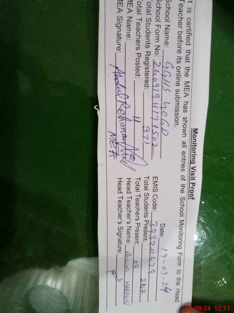 | Attendance Register | Head Teacher | MEA with School | Visit Proof |