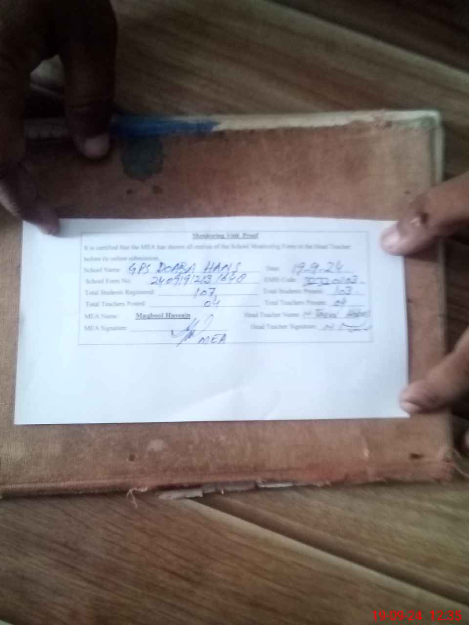 | Attendance Register | Head Teacher | MEA with School | Visit Proof |