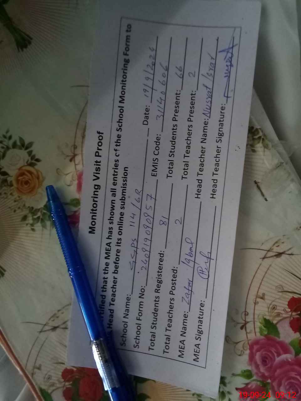 | Attendance Register | Head Teacher | MEA with School | Visit Proof |