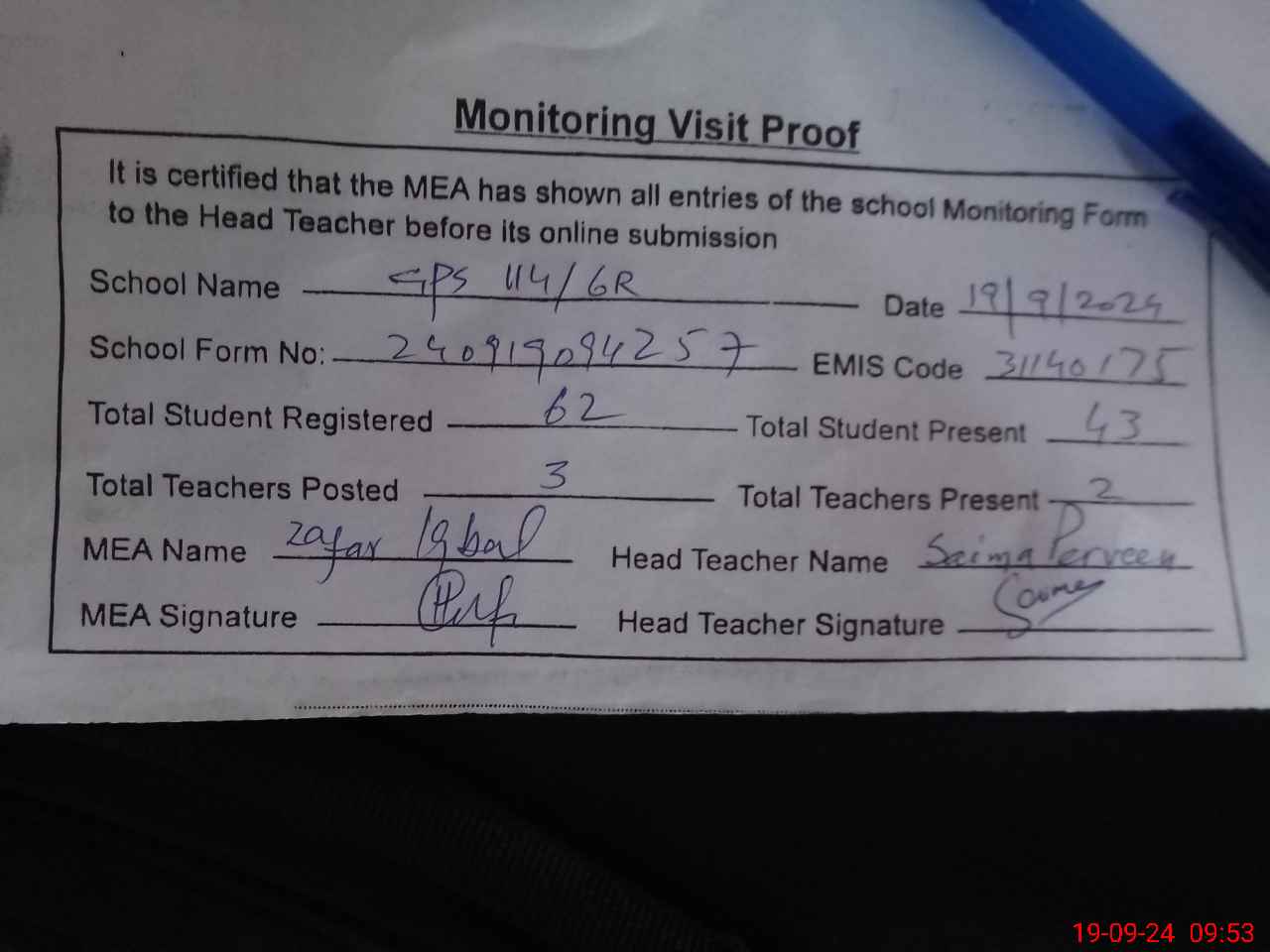 | EMIS Code: 31140175 | Name of School: GPS CHAK NO 114/6-R | |||