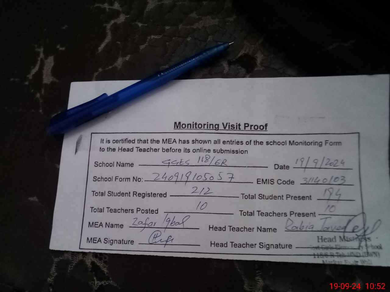 | Certified that this School was Inspected by the Undersigned MEA/DMO Today and the Information Stated Above is as Per Record. | |||||