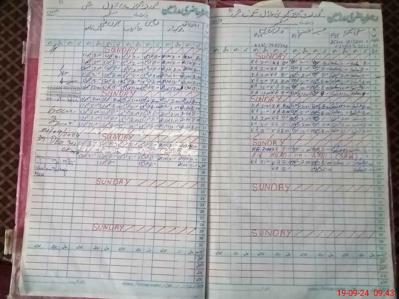 | Total no. of Classrooms: 9 No. of Classrooms Used for Teaching: 6 No. of Classrooms Storing Old Furniture, FTBs, etc: 0Comments if Any: Nominal roll for online attendance found contrary to current students records F D3 found not available Howevere head teacher stated that all enrolled students provided with free Tex books |