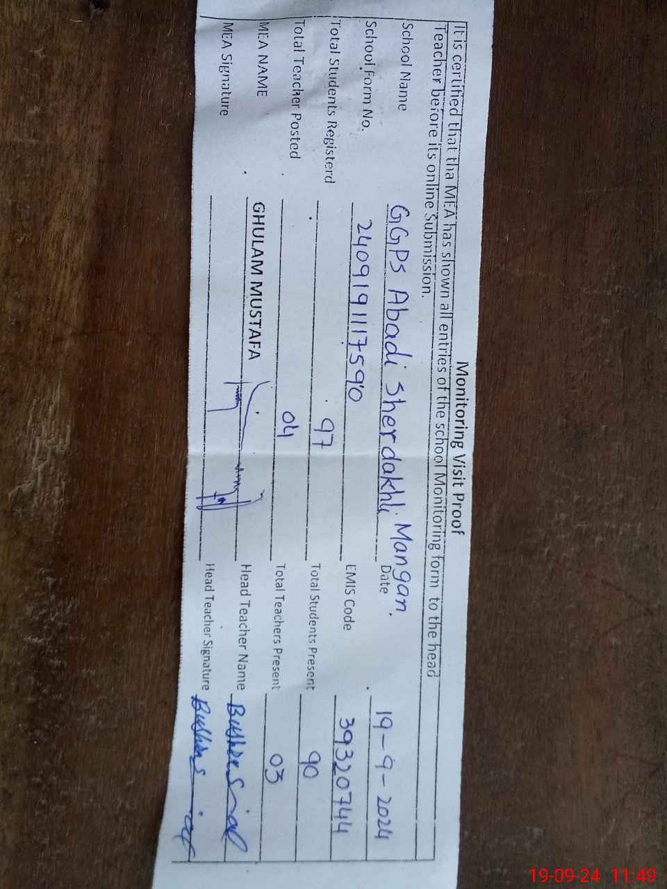 | Certified that this School was Inspected by the Undersigned MEA/DMO Today and the Information Stated Above is as Per Record. | |||||