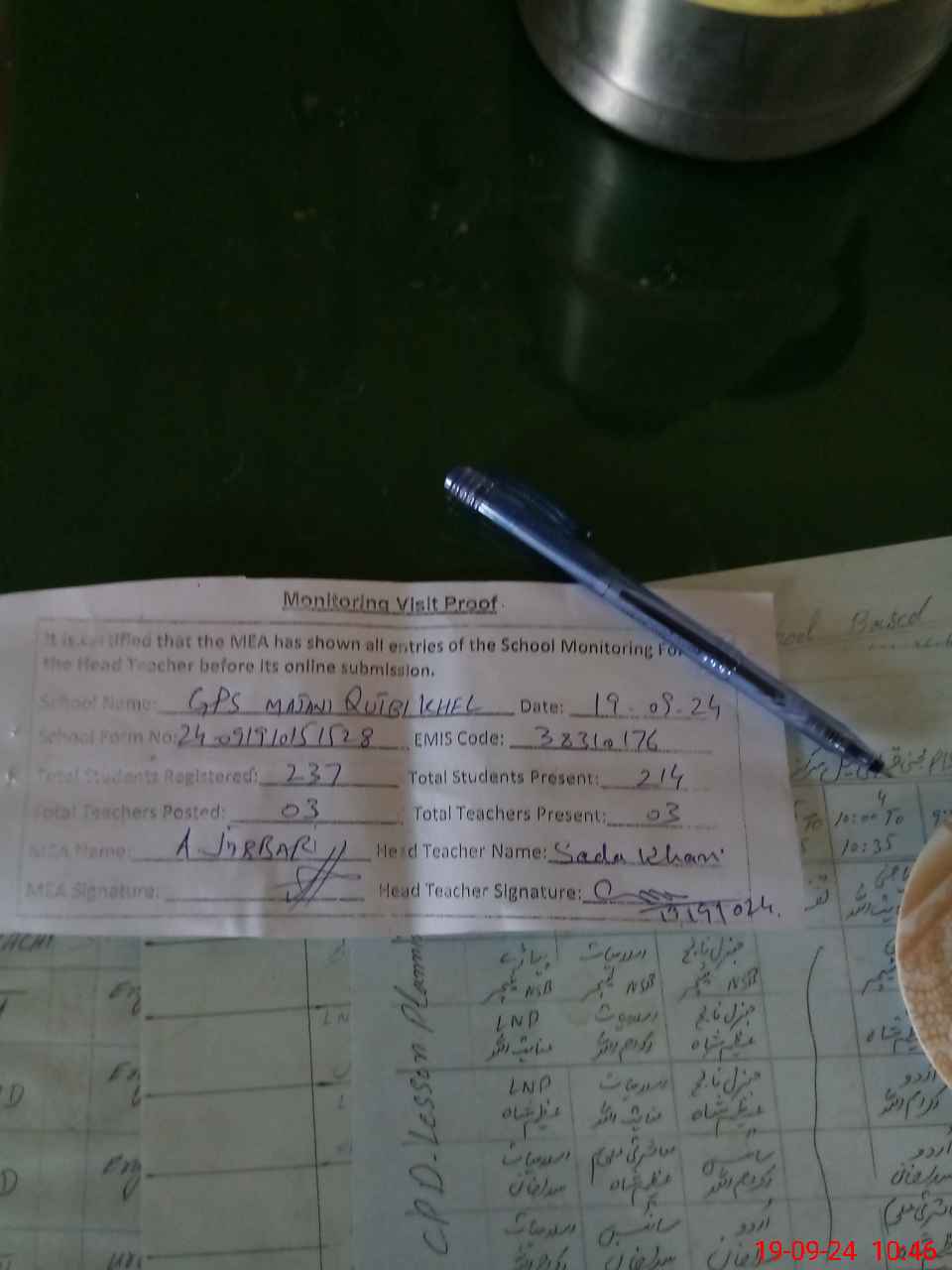 | Certified that this School was Inspected by the Undersigned MEA/DMO Today and the Information Stated Above is as Per Record. | |||||