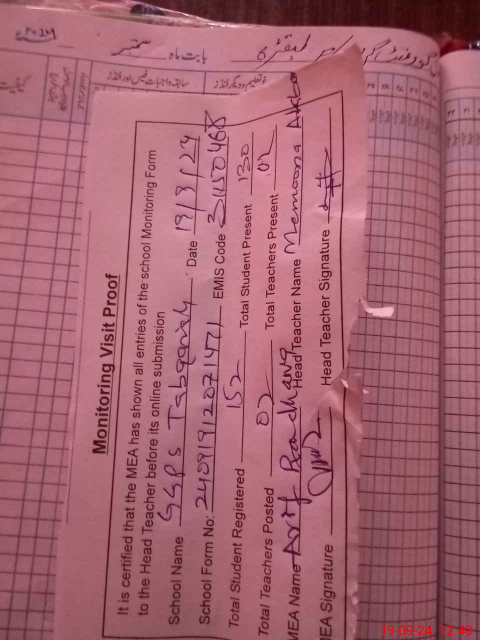 | Attendance Register | Head Teacher | MEA with School | Visit Proof |