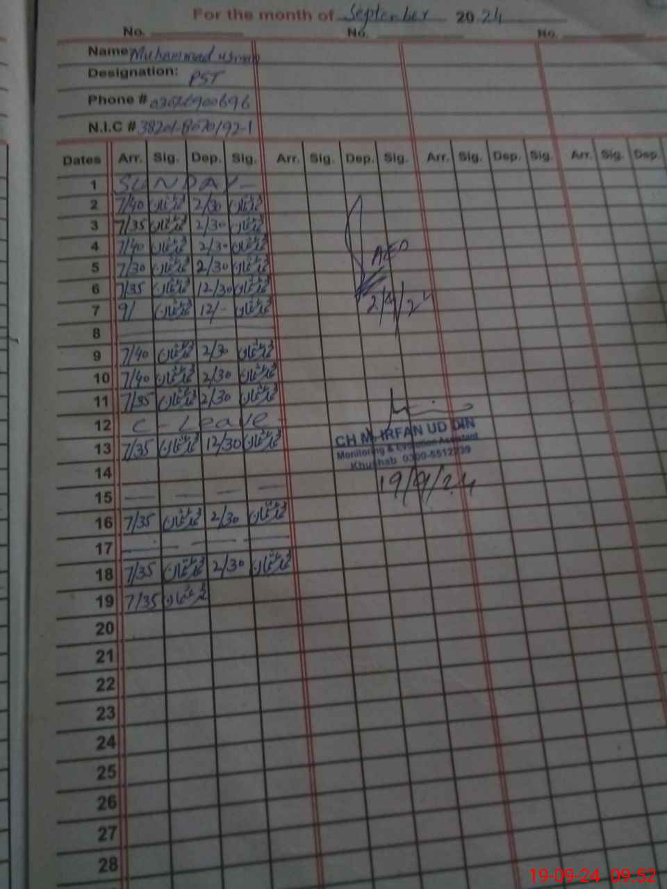 | CNIC | Full Name | Designation | R/C | Absence during last cal. month |