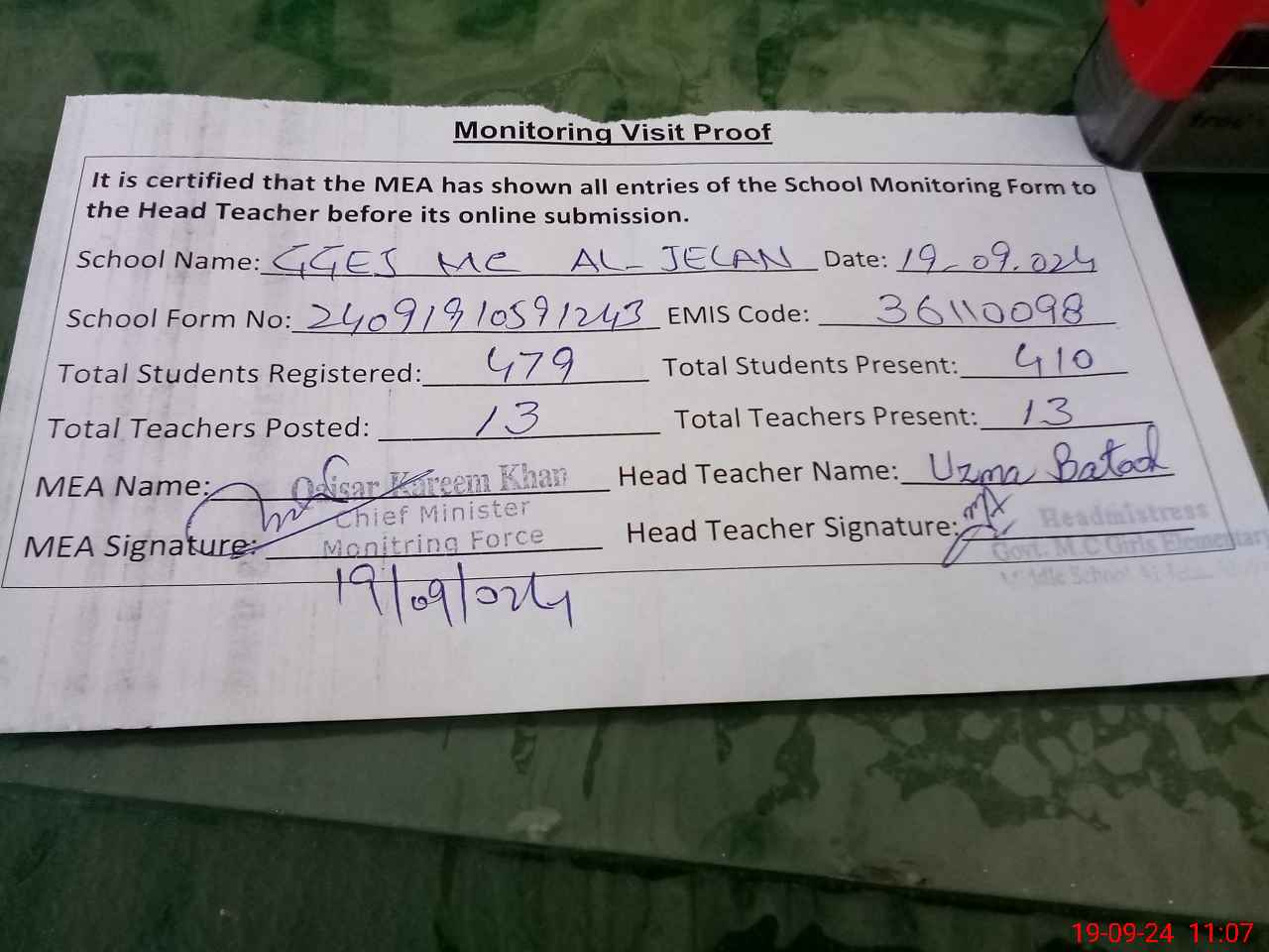| Attendance Register | Head Teacher | MEA with School | Visit Proof |