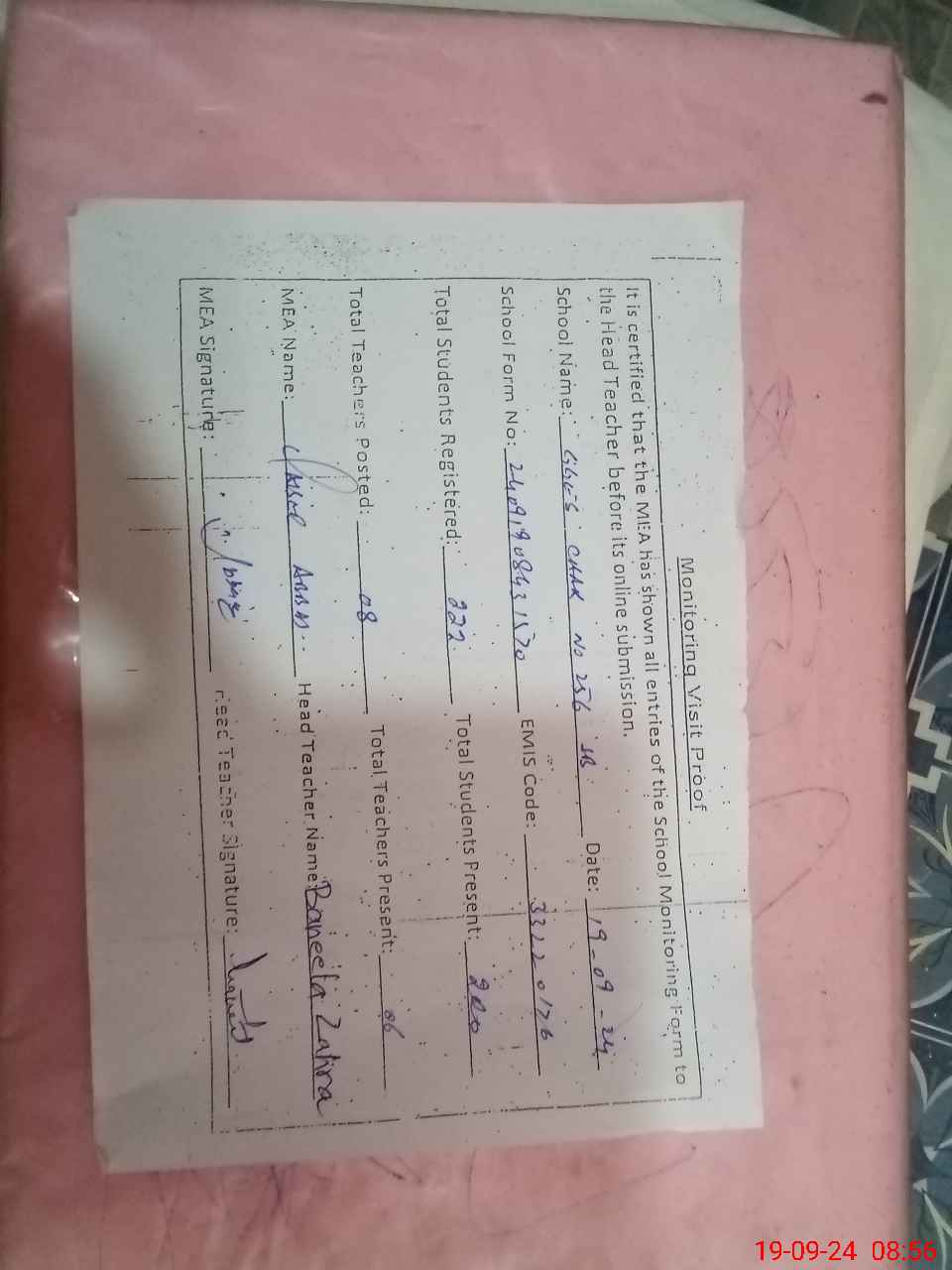 | Certified that this School was Inspected by the Undersigned MEA/DMO Today and the Information Stated Above is as Per Record. | |||||