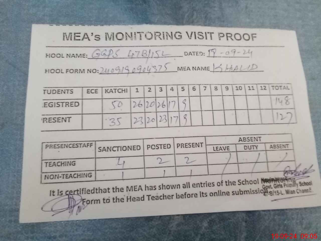 | Attendance Register | Head Teacher | MEA with School | Visit Proof |