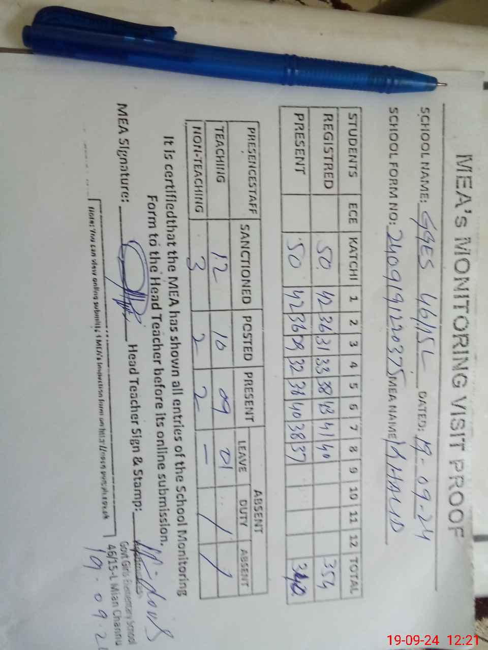 | Attendance Register | Head Teacher | MEA with School | Visit Proof |