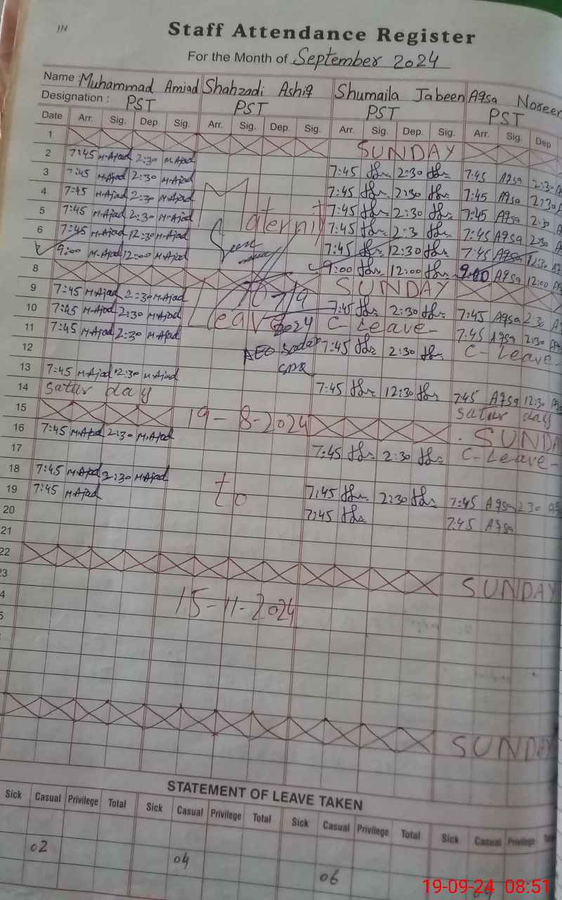 | Name: Sh**** Designation: (School Headmaster's/Headmistress's) PST Phone/Cell Number: 03**** |