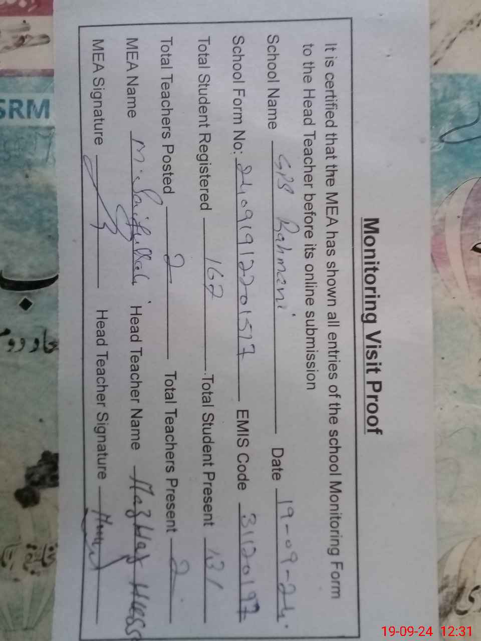 | Attendance Register | Head Teacher | MEA with School | Visit Proof |