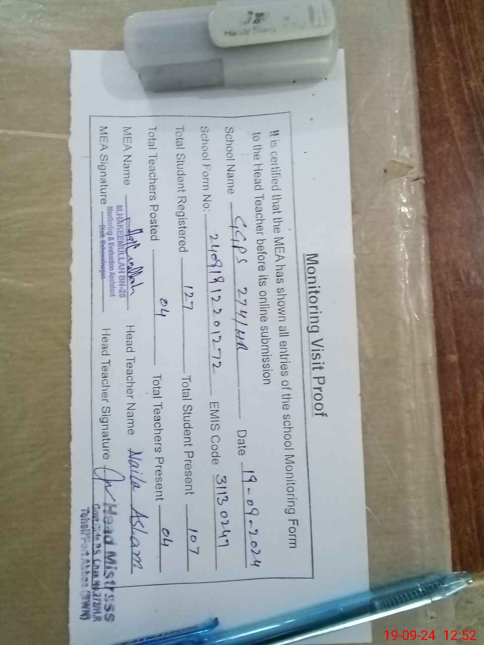 | Attendance Register | Head Teacher | MEA with School | Visit Proof |