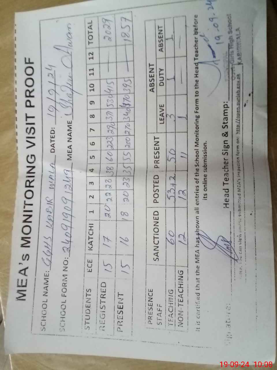 | Attendance Register | Head Teacher | MEA with School | Visit Proof |