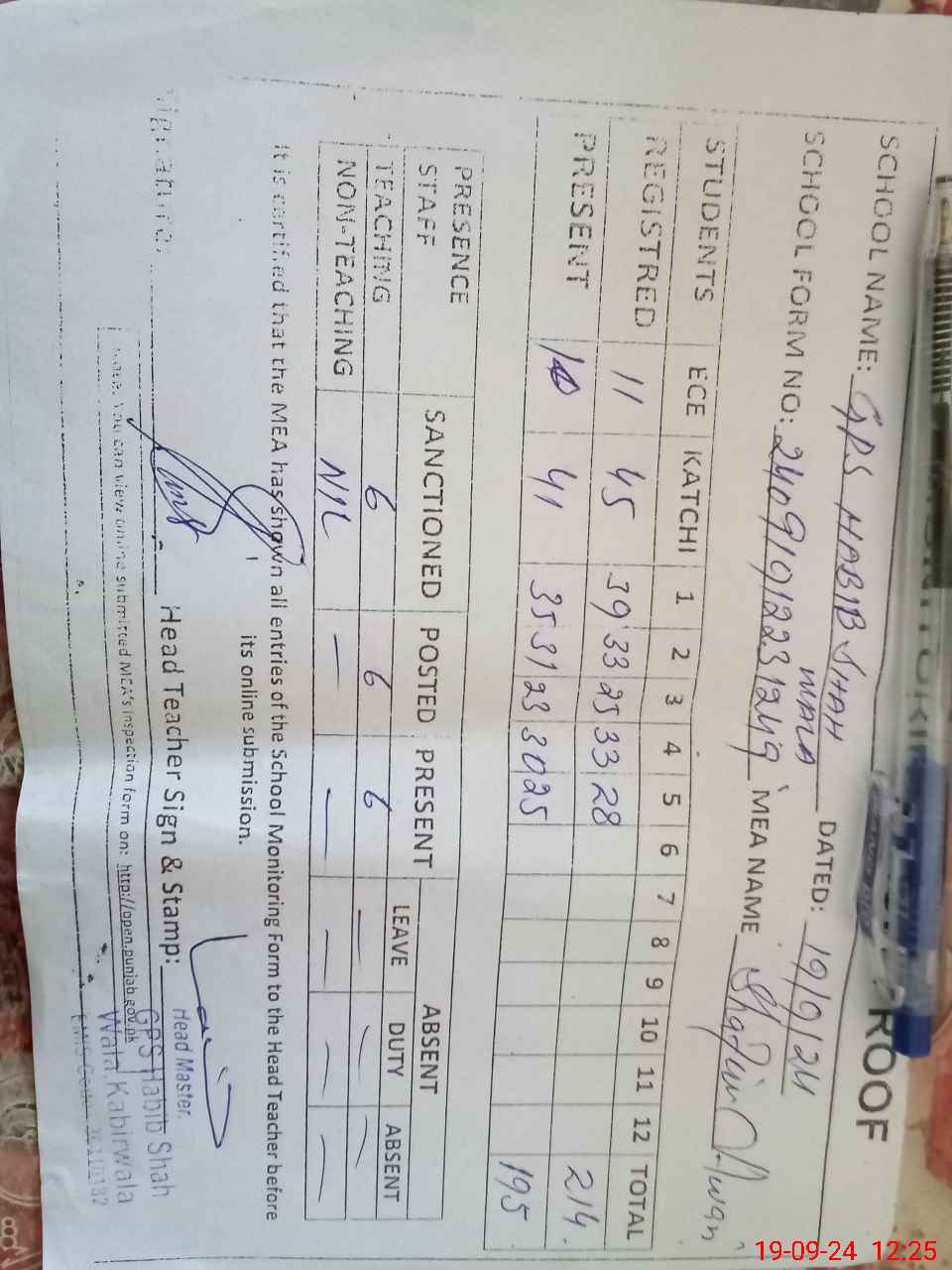 | Attendance Register | Head Teacher | MEA with School | Visit Proof |