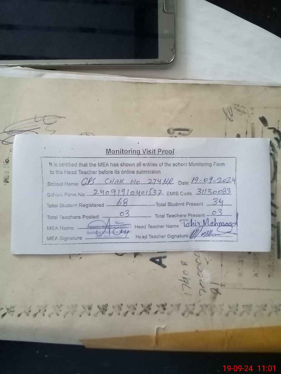 | Name: TA**** ME**** Designation: (School Headmaster's/Headmistress's) PTC Phone/Cell Number: 03**** |