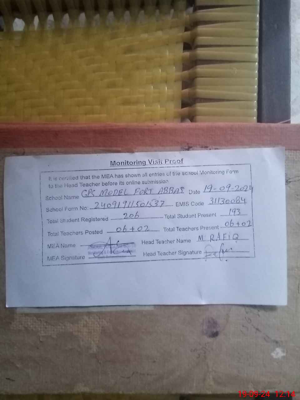 | Attendance Register | Head Teacher | MEA with School | Visit Proof |