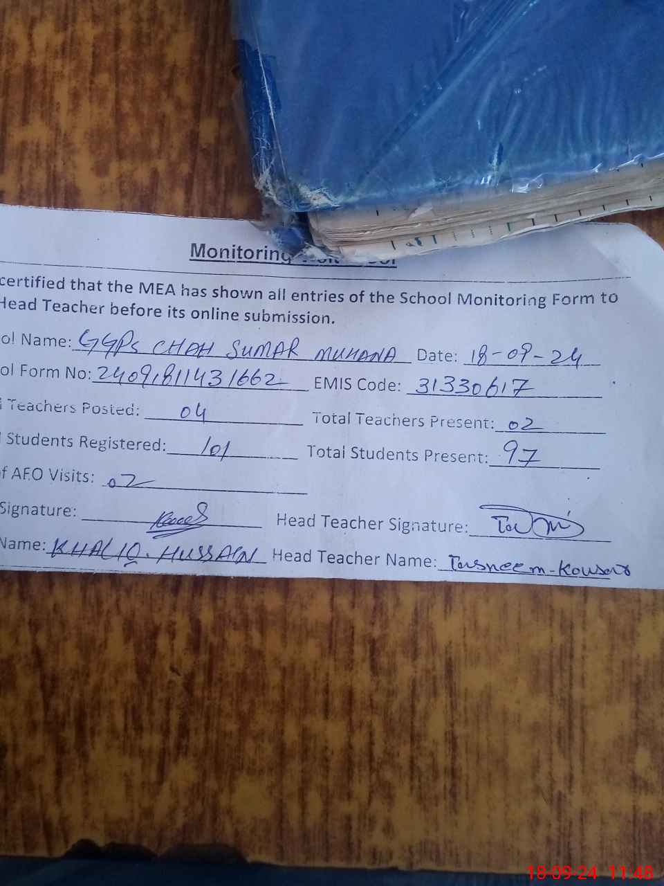 | Attendance Register | Head Teacher | MEA with School | Visit Proof |