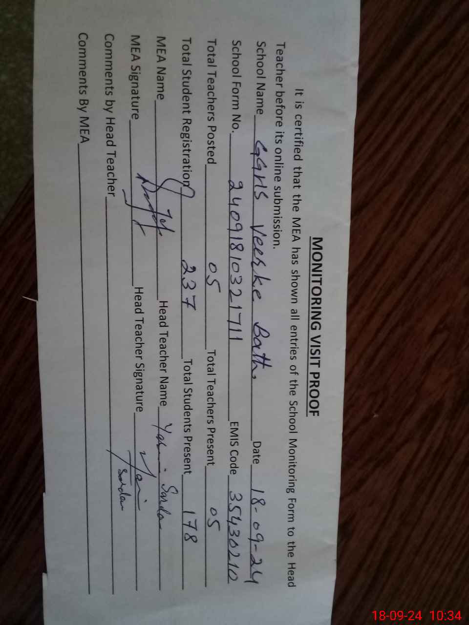 | Attendance Register | Head Teacher | MEA with School | Visit Proof |