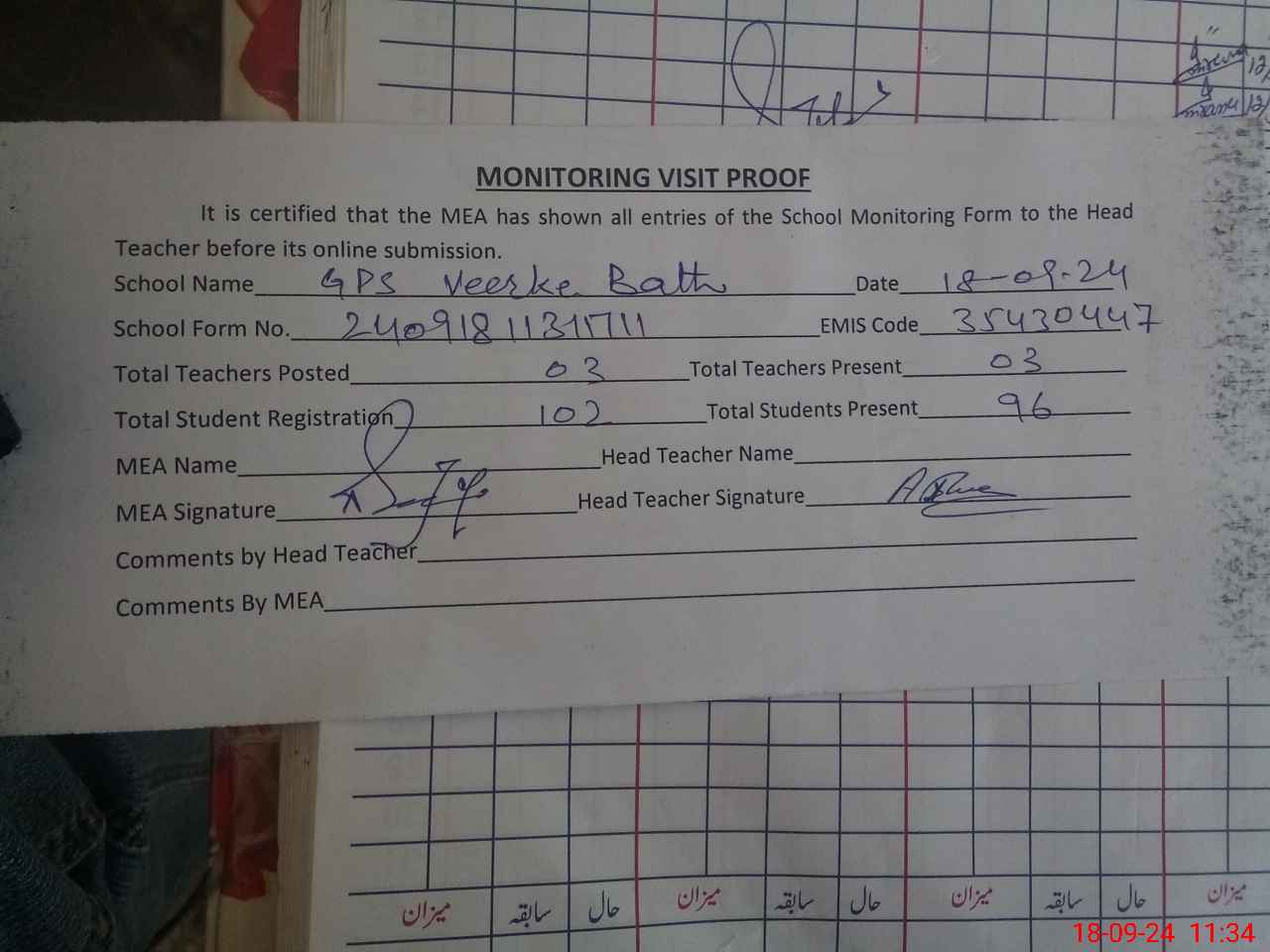 | Attendance Register | Head Teacher | MEA with School | Visit Proof |